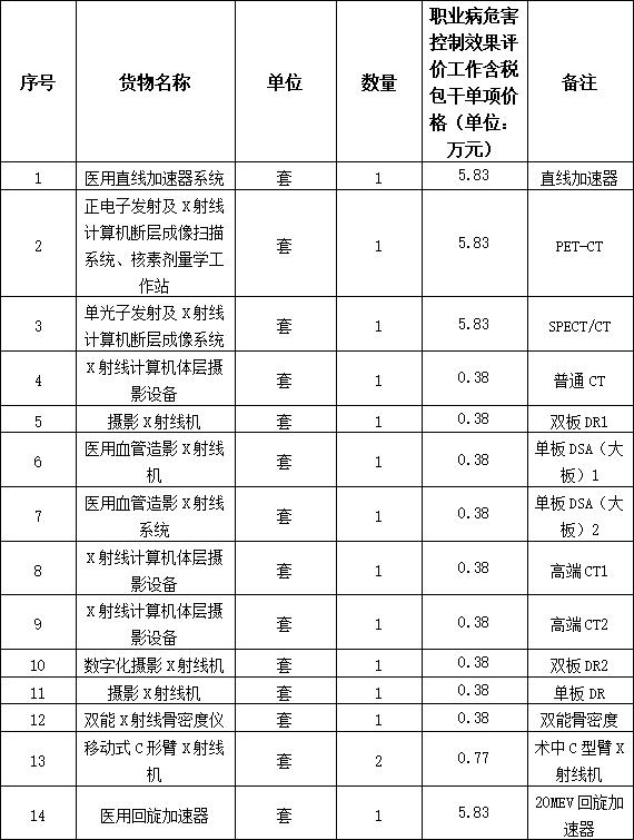 1.1.2服務(wù)內(nèi)容: 綿陽(yáng)三江醫(yī)院項(xiàng)目(一期)職業(yè)病危害控制效果評(píng)價(jià)工作全部工作內(nèi)容:進(jìn)行現(xiàn)場(chǎng)驗(yàn)收檢測(cè)并編制職業(yè)病危害放射防護(hù)控制效果評(píng)價(jià)工作報(bào)告書,協(xié)調(diào)市衛(wèi)健部門召開職業(yè)病危害控制效果評(píng)價(jià)工作報(bào)告專家審核會(huì)議,通過專家評(píng)審,并最終取得批復(fù)。具體設(shè)備如下: