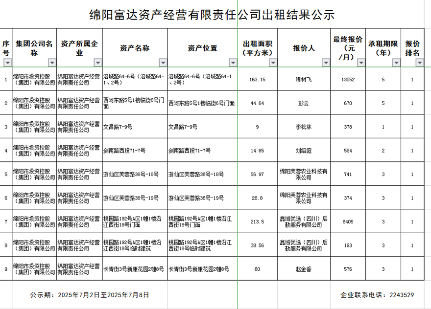 綿陽富達資產(chǎn)經(jīng)營有限責任公司出租結果公示