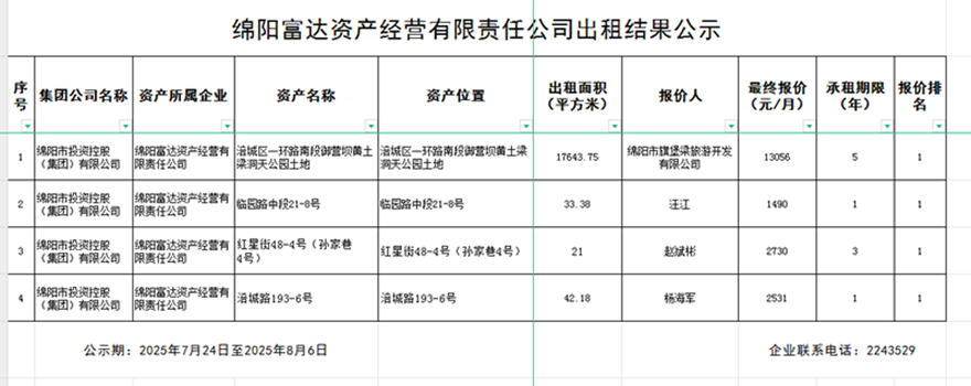 綿陽富達(dá)資產(chǎn)經(jīng)營有限責(zé)任公司出租結(jié)果公示