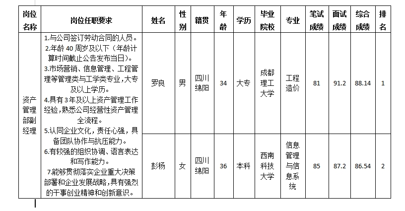 根據(jù)綿陽市綿投商業(yè)運營管理有限責任公司發(fā)布的競聘公告及競聘相關(guān)規(guī)定,經(jīng)筆試、面試等程序,現(xiàn)將筆試(面試)成績予以公示。