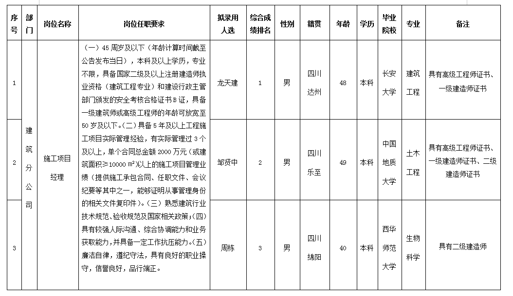 根據(jù)四川嘉來建筑工程有限公司發(fā)布的招聘公告及招聘相關(guān)規(guī)定,經(jīng)筆試、面試、考察、體檢等程序,擬錄用龍?zhí)旖?、鄒賢中、周棟同志到四川嘉來建筑工程有限公司工作,現(xiàn)予以公示,具體情況如下: