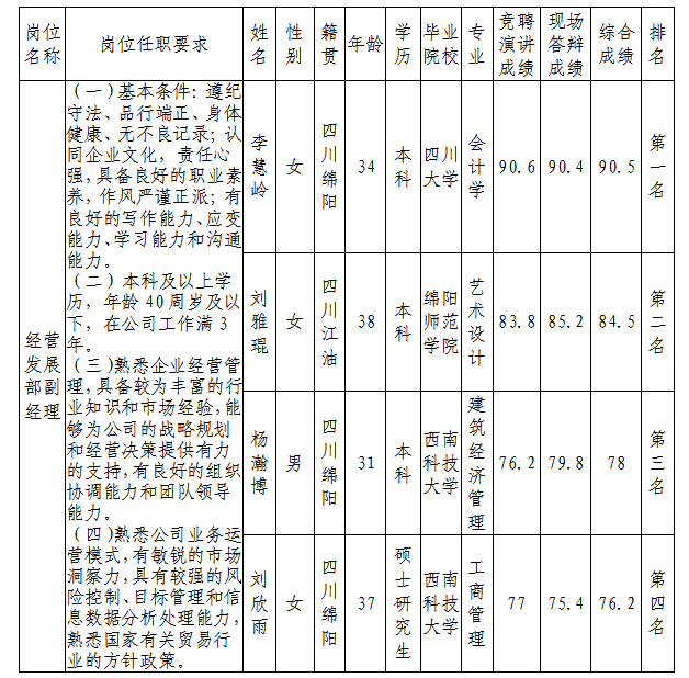 根據(jù)四川西津物有限責(zé)任公司發(fā)布的招聘公告及招聘相關(guān)規(guī)定,經(jīng)競聘演講、現(xiàn)場答辯等程序,現(xiàn)將競聘成績予以公示。