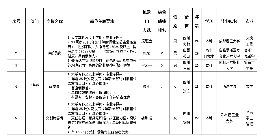 根據(jù)四川越王樓文化傳播有限公司發(fā)布的招聘公告及招聘相關(guān)規(guī)定,經(jīng)筆試、面試、考察、體檢等程序,擬錄用龐思遠(yuǎn)等同志到越王樓公司工作,現(xiàn)予以公示,具體情況如下: