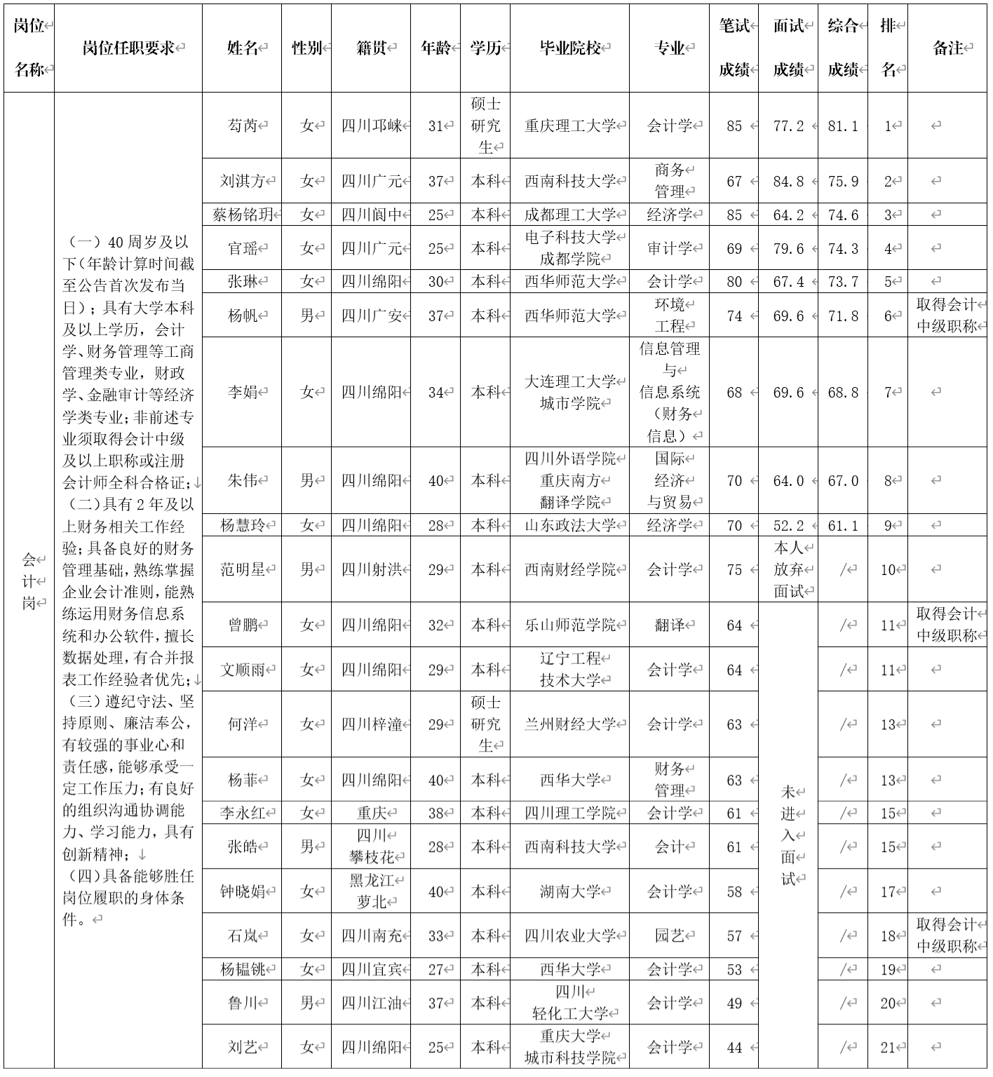 根據(jù)綿陽金控投資管理有限責(zé)任公司發(fā)布的招聘公告及招聘相關(guān)規(guī)定,經(jīng)筆試、面試等程序,現(xiàn)將筆試(面試)成績予以公示。