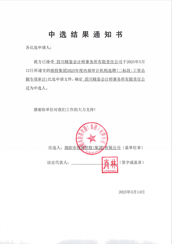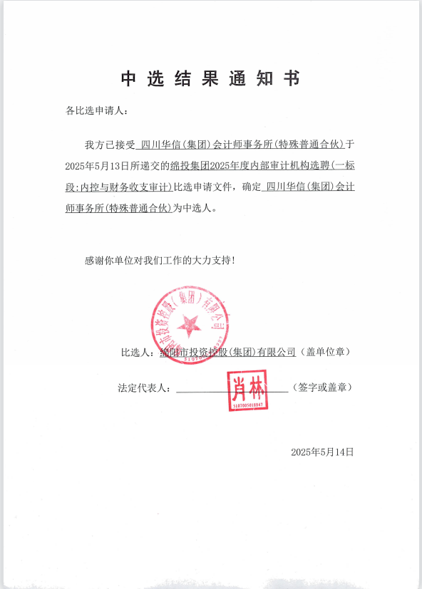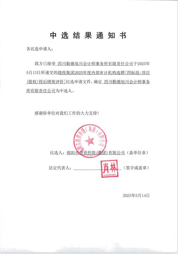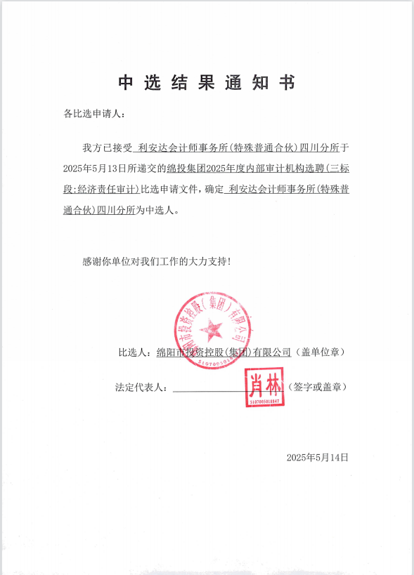 綿投集團2025年度內部審計機構選聘中選結果通知書