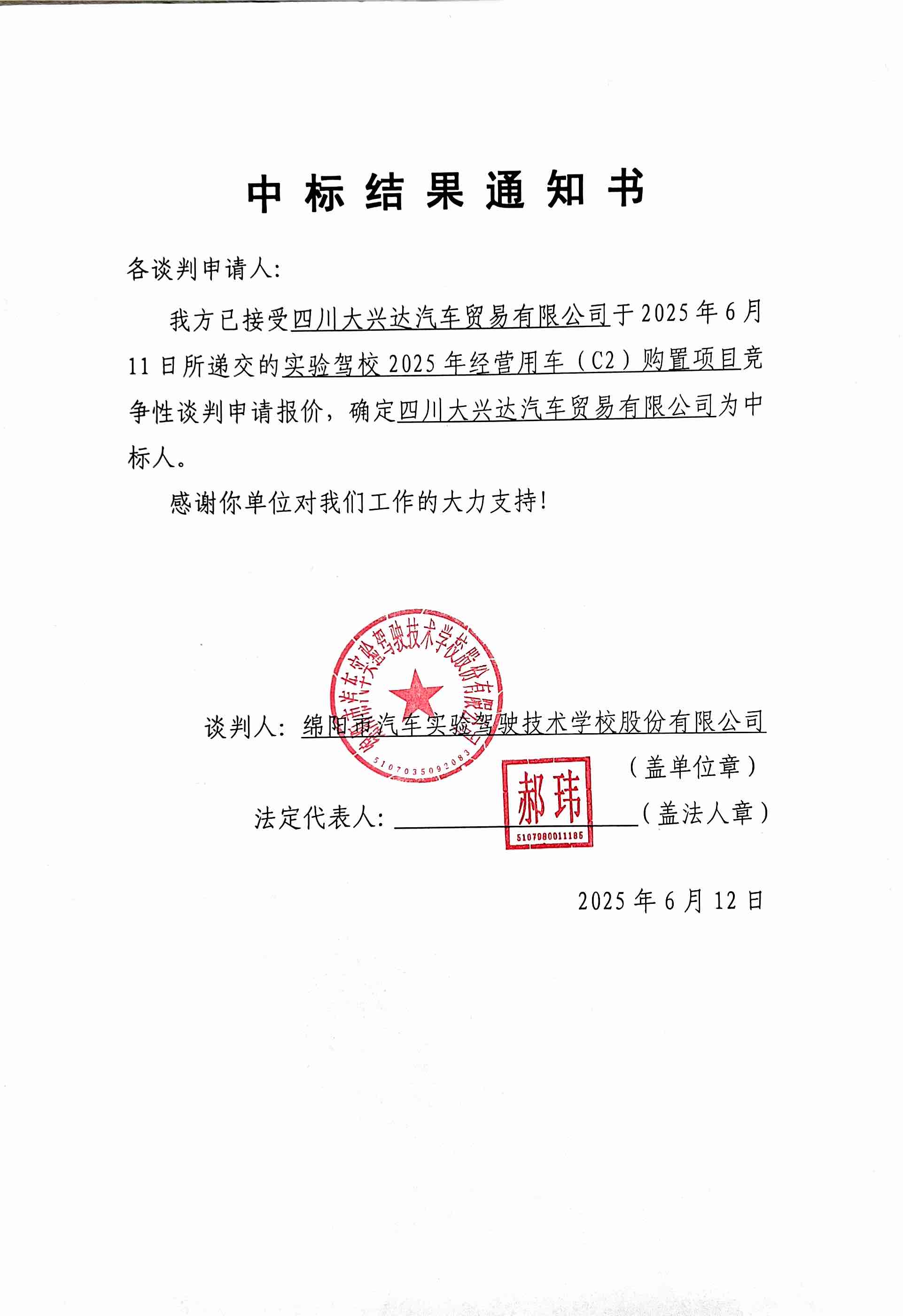 實(shí)驗(yàn)駕校2025年經(jīng)營(yíng)用車(C2)購(gòu)置項(xiàng)目中標(biāo)結(jié)果通知