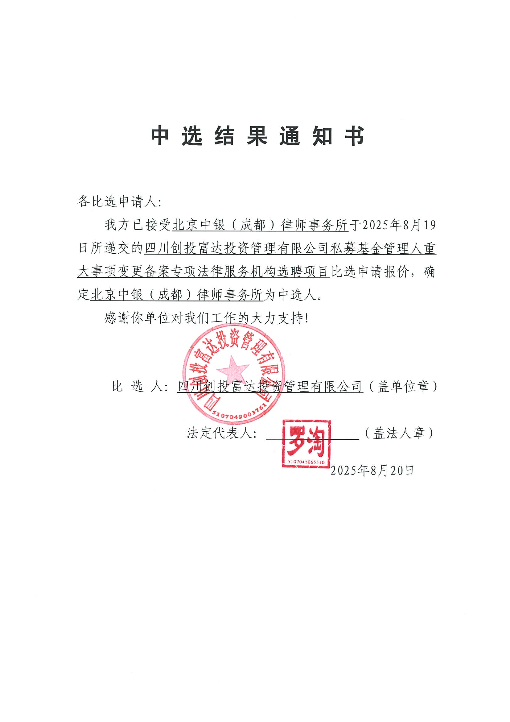 創(chuàng)投富達私募基金管理人重大事項變更備案專項法律服務機構選聘中選結果通知